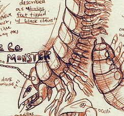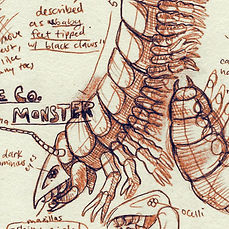 AKA: Fireco Varmint, Fire Co. Monster He heard it every night, felt the tremor of its proximity—the creature’s rough, lengthy body under his house, scraping against the foundation before settling into silence, stillness. The behemoth lay just below his bedroom, so near he could hear the irregular snap of its unseen maw: ‘clack’, ‘ka-lack.’ There it taunted him with a one-note thrum, a sound so low he had to focus to hear it. Then, as always, a nightmarish scene began. Forms of a shadowy creature with a pointed head and snake-like body plagued his walls; it moved like a living being, swimming in curving patterns, snapping the heads off of other figures that ran across the wallpapered backdrop. Time feeling sluggish, the shadow took a more concrete form, turning towards him and off the wall, leveling to allows its empty eyes to meet his own. Compelled to run and fight, yet lulled into a stupor, he watched, listened, and lay as the beast strangled him, mocked him, and consumed his sanity. - West Virginian folk story The Fireco Monster is a large millepede with fifty pairs of legs; these appendages end in baby-feet-shaped nubs tipped with sharp, black claws. From the front, dark, ominous eyes gaze forward-both unmoving, glassy, and deep-set on either side of the snout. Above, two long, ebony antennas protrude from its head; from below, a wide mouth with thousands of tiny teeth are protected by sturdy mandibles. Firecos have black, shimmering, armored bodies with tan undersides that are often coated in mud and debris. When the arthropods surface during heavy rains, they leave behind footprints as large as a man’s fist; when a shower turns to a drizzle, their pointed heads tunnel quickly and easily back underground. The giant millipedes’ tunnels may stretch for miles through rock and soil before resurfacing; on average, the passageways are 1 - 2 ft. in diameter. At their fastest, the creatures can rip up 50 lbs. of dirt in a minute. When moving at top speeds, the number of legs and claws they appear to have double, blurring together in a frenzy. They are most active on cool, damp nights; yet, the millipedes move at all times of the day, though at a slower pace. It spends its days tunneling and consuming dirt, rocks, and anything else that happens to be in front of it. Though it does not seek out organisms to eat, the centipede enjoys being near other beings - especially people;they find human voices and the bustle of activity soothing. It, however, does not have the same effect on those above. Aside from causing great destruction underground, this cryptid is known to influence sentient beings around it with a depressing, irritating aura. The Fireco Monster impresses several negative inclinations upon those residing on the surface, such as: substance abuse, gambling addiction, theft, lethargy, mood swings, aggressiveness, greed, and irresponsibility. The creature does this by producing several mind and mood-altering frequencies; prolonged exposure to the arthropods’ sounds cause those in range to experience hallucinations and delusions. Most often, humans report hearing disembodied voices or seeing several giant, monstrous shadows. When several of these creatures gather under one community, they can completely ruin the lives of those in it within a short time. Thankfully, the millipedes live no longer than a year. Yet, the amount of damage they can cause in their lifetime is substantial. Before their death, males and females meet to mate. Eggs are laid underground in pockets deep within their tunnels; once reproductive instincts have been satiated, both die within seven days. Up to thirty eggs can be spread throughout their maze-like domains - unprotected, but well hidden. Set in the ceiling, the eggs are coated in a thick, green, slimy substance that keeps them in place; they incubate for five years before hatching. Efforts are made each during quiet periods to find these hatcheries and destroy them. Once free from their gooey encasing, newborn Firecos grow rapidly, reaching three ft long in one month; they then continue to enlarge for the rest of their life, tunneling under and around human gatherings.